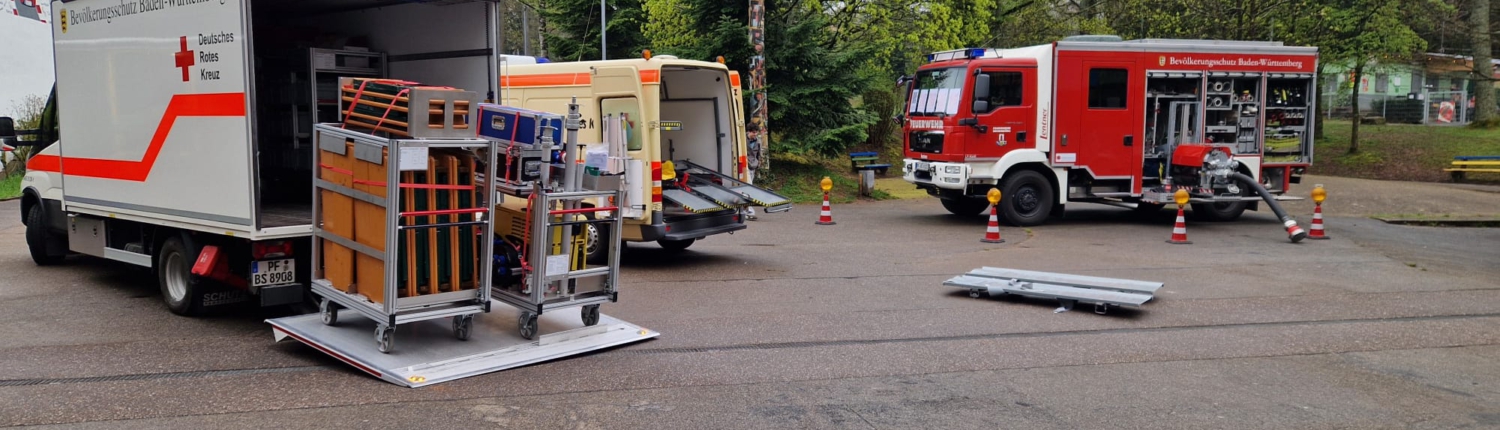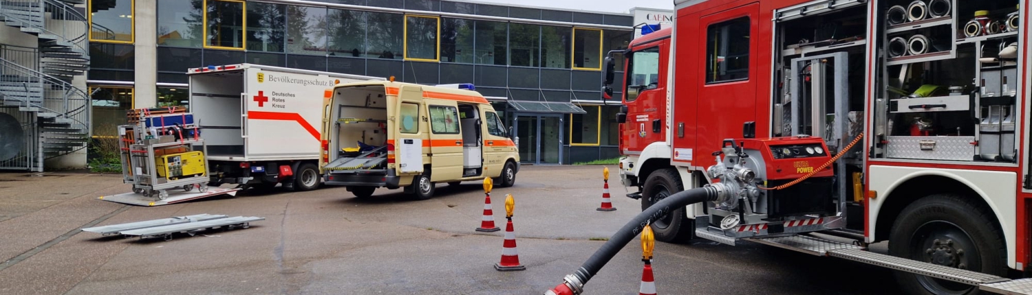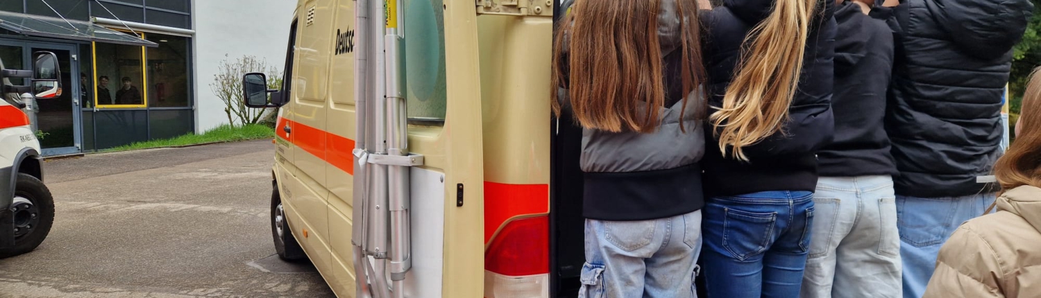Unterstützt wurde die Schule dabei von der örtlichen Feuerwehr sowie dem Deutsches Rotes Kreuz (DRK). Bereits auf dem Schulhof konnten die Schülerinnen und Schüler Einsatzfahrzeuge aus nächster Nähe bestaunen: ein Feuerwehrfahrzeug des Bevölkerungsschutzes, ein Krankentransportwagen (KTW) und ein Logistikfahrzeug des DRK.