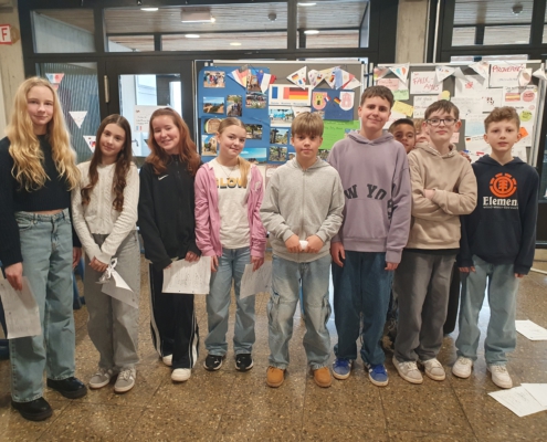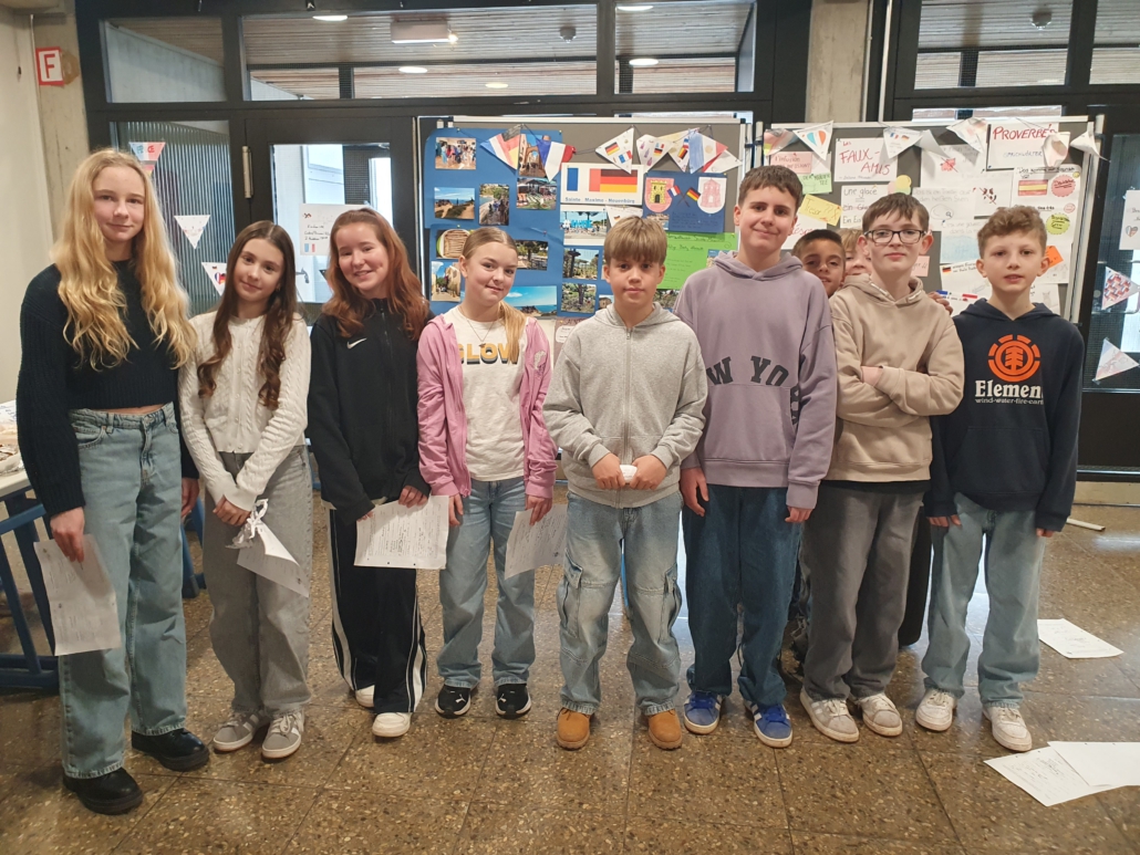 Für den 22.01. bereiteten daher mehrere Französischklassen verschiedene Projekte vor. Besonders beliebt ist der französische Kuchenverkauf der 6. Klassen, die von ihren Lehrerinnen Frau Eckert und Frau Schumm tatkräftig unterstützt wurden. Die Fachschaft Französisch organisierte die entsprechende Dekoration, um französisches Flair nach Neuenbürg zu bringen. Es wurden Plakate über das damalige Ereignis, die Geschichte Frankreichs und Werbeslogans für den nächsten Schüleraustausch gestaltet und ausgestellt. Als besonderes Highlight präsentierte die Klasse 6b, gemeinsam mit Frau Schumm, ihren für diesen Tag einstudierten französischen „Rap de Neuenbürg“ und sorgten damit für gute Stimmung in der Aula.