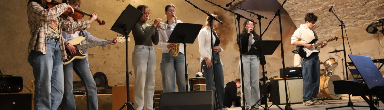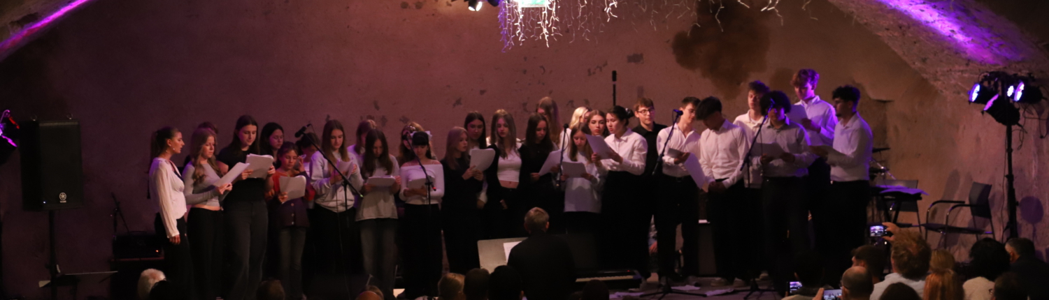 Im atmosphärischen Schlosskeller verbreiteten die Unterstufenchöre des Gymnasiums unter Leitung von Julia Schumm und Dorothea Merkel gute Laune. Viele bekannte Hits, die die jungen SängerInnen, begleitet von der Unterstufenband, mit Begeisterung darboten, luden zum Mitswingen ein.