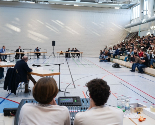 Auf dem Podium diskutierten der Direktkandidaten des Enzkreises: Alexander Steblau (AfD), Nico Gunzelmann (CDU), Stefanie Seemann (Bündnis 90/Die Grünen), Erik Schweickert (FDP), Vera Seifert (Volt) und Cedric Strauß (Die Linke). Moderiert wurde die Veranstaltung von den Lehrkräften Herrn Lenz und Frau Schmalbach.